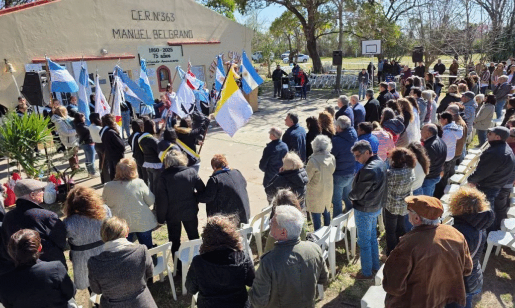 La ceremonia incluyó el ingreso de las banderas de ceremonias de instituciones educativas de la región, el toque de la histórica campana escolar —a cargo de la Prof. Gladys Pascual, docente jubilada— y el izamiento de la Bandera Nacional por el exalumno Ángel Anselmo Mijojevich, acompañado por la Sra. Ceres Martoglio de Caporaletti, esposa del primer docente de la institución, Don Oreste Caporaletti.