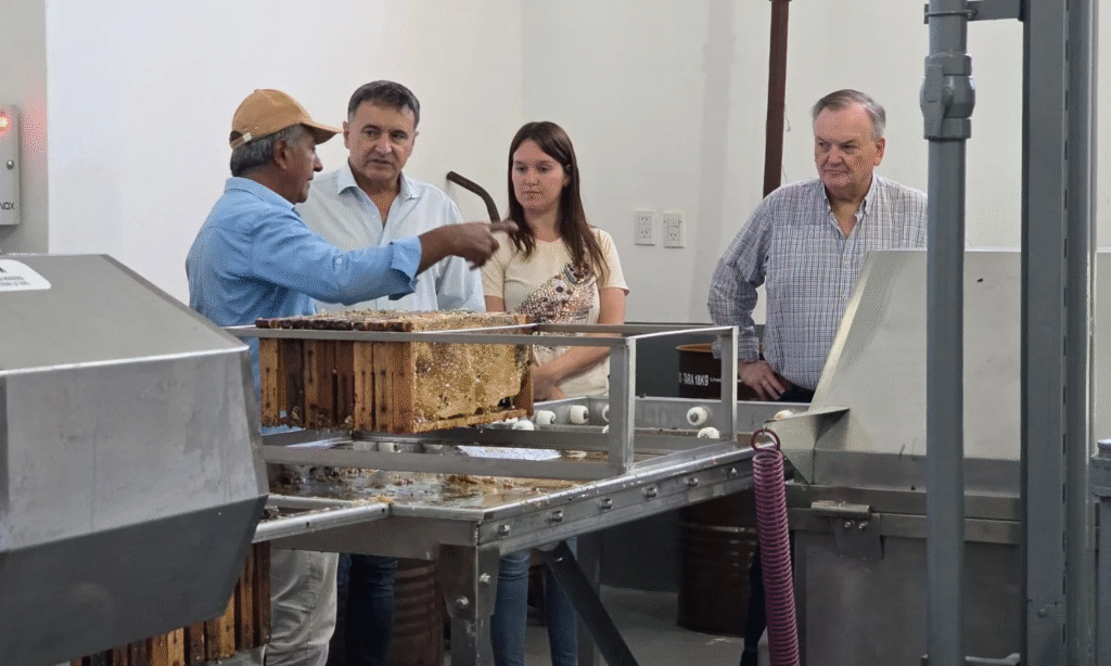 El senador Felipe Michlig, acompañado por el diputado Marcelo González y la presidente comunal de Ambrosetti, Dianela Michlig, visitó la flamante Sala de Extracción de Miel de la Cooperativa de Apicultores de Ambrosetti (C.A.A.L), recientemente inaugurada y ya en plena actividad productiva.